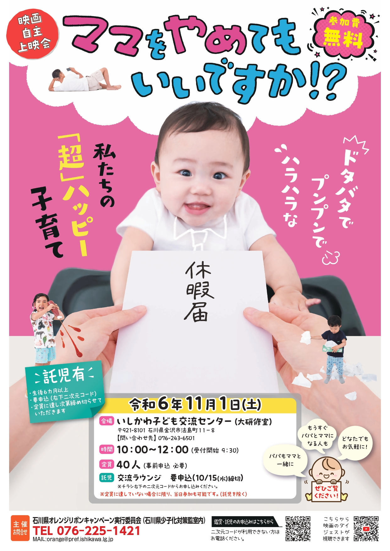 11月のキャンペーン期間中、県内で上映会や座談会が開催されます。映画「ママをやめてもいいですか⁉」は「ママの子育て」にスポットをあて、俳優の大泉 洋さんがナレーションの笑って泣ける共感度2000%のドキュメンタリー映画です。ご夫婦でぜひご覧ください!